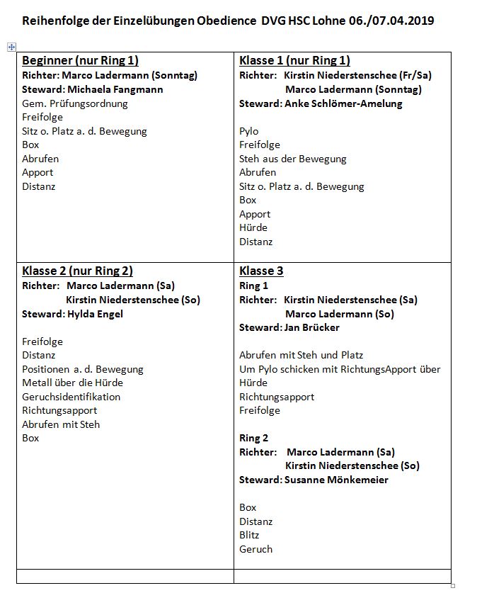 Gestartet wird in 2 Ringen (Klasse Beginner, 1 und 2 alle Übungen in einem Ring, Klasse 1 & 2 starten parallel; Klasse 3 : Übungen in 2 Ringen aufgeteilt und es wird zeitgleich in beiden Ringen gestartet) Starter der Landesmeisterschaft (Klasse 1-3) haben Vorrang. Die verbliebenen Startplätze (Beginner, Klasse 1-3) werden aufgefüllt für das offene Turnier. Starter für die Landesmeisterschaft bitte mit entsprechender Startberechtigung (Mitglied im DVG LV Weser Ems + min. 1 Gut in einer DVG termingeschützten Prüfung in der jew. Klasse im Qualifikationszeitraum (03.06.18-23.03.19) (siehe Obedience-Ordnung des LV Weser Ems).– Scan/Foto der Leistungsurkunde als Nachweis sowie den Meldeschein bitte zur Meldung bei Caniva hochladen).