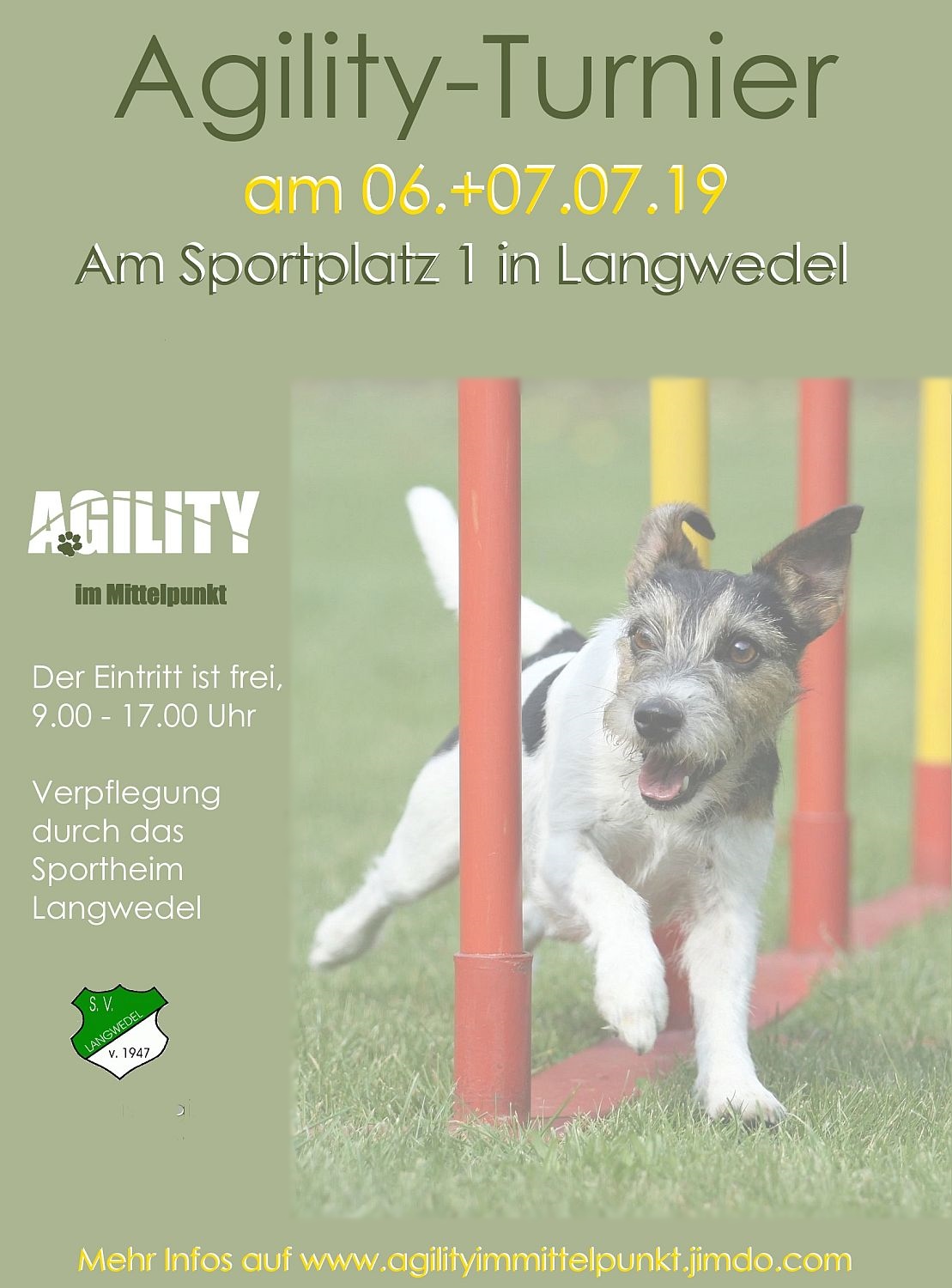 Weiter geht´s... 3. Agility-Turnier in Langwedel, wie im letzten Sommer, möchten wir auch in 2019 wieder ein tolles Agility-Turnier mit euch verbringen. Wieder auf den schönen Sportanlagen des SV-Langwedel mit Verpflegung vom Sportheim Langwedel. Nicole Paulmann und ihre Crew werden wieder für euer leibliches Wohl sorgen. Wir freuen uns schon riesig auf Euch! Das Motto für 2019 haben wir auch schon im Kopf... lasst euch überraschen ;-)