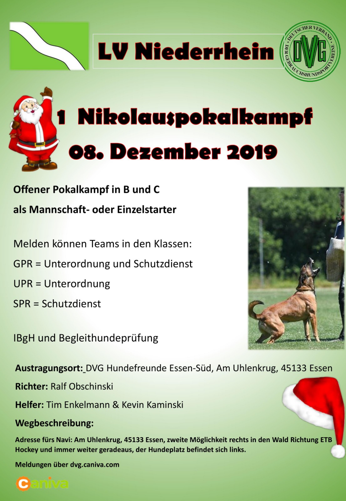 Der LV Niederrhein richtet einen Nikolauspokalkampf aus. Es kann in BH, IBGH, UPR und SPR gemeldet werden. Jeweils 2 Starter bilden ein Team. Einzelstarter als GPR sind ebenfalls möglich